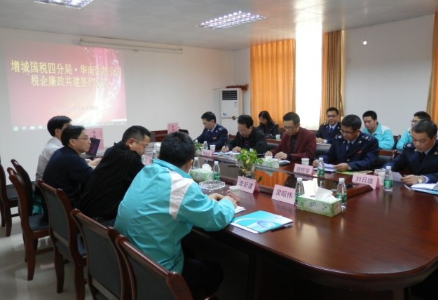 2012年12月14日上午,我司和增城國稅四分局組織舉辦了“增城國稅四分局·華南生物公司稅企廉政共建”簽約儀式,增城市國稅局領(lǐng)導(dǎo)鐘其立、陳繼文、胡桂榮、劉日雄、羅奇亮蒞臨我司出席儀式。