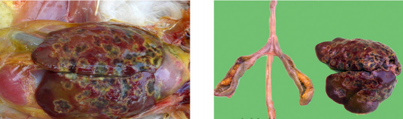3、禽傷寒:肝臟變成淡綠棕色或古銅綠色,肝臟表面有時有灰白色米粒狀壞死點。
