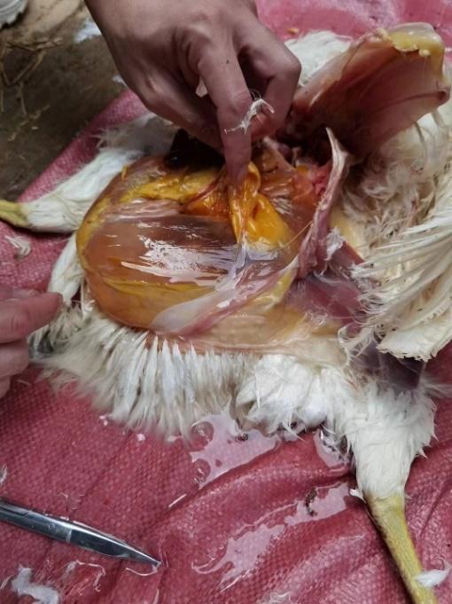 茂名某規(guī)模化蛋雞場(chǎng)飼養(yǎng)蛋雞3棟,單棟1.5萬(wàn)只。A棟雞從開(kāi)產(chǎn)到230日齡產(chǎn)蛋率一直上不去,維持在85%左右。大群采食量和飲水正常,平均每只雞采食量為105g,大群精神狀況良好,糞便正常。臨床觀察發(fā)現(xiàn)個(gè)別雞只(30只左右)腹部膨大下垂,觸之有波動(dòng)感。頭頸高舉,行走時(shí)呈企鵝狀姿勢(shì)。B棟和C棟無(wú)此情況。