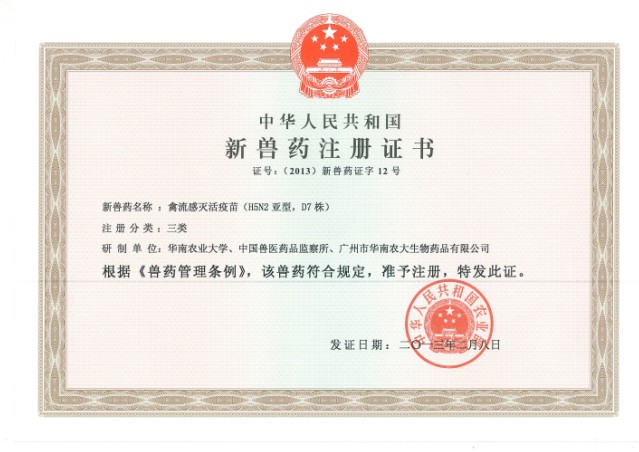 根據(jù)《獸藥管理?xiàng)l例》和《獸藥注冊(cè)辦法》規(guī)定,廣州市華南農(nóng)大生物藥品有限公司與華南農(nóng)業(yè)大學(xué)、中國(guó)獸醫(yī)藥品監(jiān)察所3家單位共同申報(bào)的禽流感滅活疫苗(H5N2亞型,D7株)通過(guò)了國(guó)家農(nóng)業(yè)部的審查,批準(zhǔn)為新獸藥。即將取得農(nóng)業(yè)部核發(fā)的《新獸藥注冊(cè)證書》,證書主要信息如下: