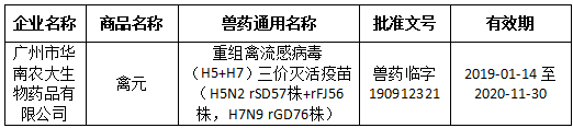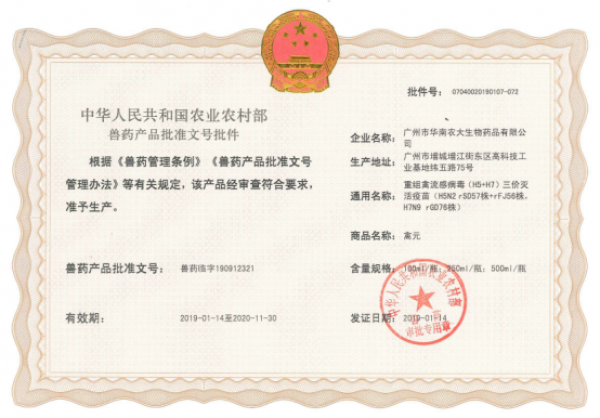 2019年1月14日,由華南農(nóng)業(yè)大學(xué)、中國(guó)獸醫(yī)藥品監(jiān)察所、廣州市華南農(nóng)大生物藥品有限公司(以下簡(jiǎn)稱“華南生物”)共同研制的重組禽流感病毒(H5+H7)三價(jià)滅活疫苗(H5N2 rSD57株+rFJ56株,H7N9 rGD76株)通過(guò)農(nóng)業(yè)部獸藥產(chǎn)品批準(zhǔn)文號(hào)的審批,喜獲得農(nóng)業(yè)部核發(fā)的獸藥產(chǎn)品批準(zhǔn)文號(hào)——獸藥生字190912321;商品名:禽元。