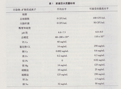 水對(duì)養(yǎng)分的消化、吸收、轉(zhuǎn)運(yùn)和廢物排泄有著重要的作用。水是廉價(jià)、容易得到,也是容易被忽略的重要養(yǎng)分。在大生產(chǎn)中通常會(huì)注意給水的數(shù)量,即會(huì)經(jīng)常檢查飲水乳頭的好壞,卻容易忽視飲水的質(zhì)量。實(shí)際上在生產(chǎn)中經(jīng)常遇到的雞群生產(chǎn)成績(jī)不正常,易患卵黃性腹膜炎及其他疾病,這種情況通常與飲水質(zhì)量有關(guān)。表1列出了家禽飲水質(zhì)量的相關(guān)標(biāo)準(zhǔn),在生產(chǎn)中重視飲水質(zhì)量會(huì)給種雞生產(chǎn)帶來事半功倍的效果。