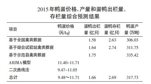 基于三種數(shù)據(jù)來源(全國禽類數(shù)據(jù)、12個(gè)蛋鴨主產(chǎn)省區(qū)禽類數(shù)據(jù)和示范縣禽類數(shù)據(jù))采用比例調(diào)整法對(duì)蛋鴨出欄量和鴨蛋產(chǎn)量進(jìn)行了推算,預(yù)測(cè)出2015 年蛋鴨出欄量為1.66億只,與2013年相比增加20.29%,產(chǎn)蛋量為317.73萬噸,與2013年相比略有下降,下降幅度為5.92%;基于兩種數(shù)據(jù)來源(全國禽類數(shù)據(jù)、12個(gè)蛋鴨主產(chǎn)省份禽類數(shù)據(jù))對(duì)蛋鴨存欄量進(jìn)行了預(yù)測(cè),預(yù)測(cè)出2015年蛋鴨存欄量為2.69億只,與2013年相比增加39.38%;采取兩種方法(ARIMA模型和二次曲線法)對(duì)鴨蛋價(jià)格進(jìn)行了預(yù)測(cè),根據(jù)兩者預(yù)測(cè)結(jié)果匯總得出,2014年底至2015年初,每千克鴨蛋價(jià)格將維持在9.47元~11.71元之間,在節(jié)假日會(huì)有小幅上漲,與2013年相比基本無變化。