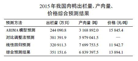 由于2013年受人感染H7N9流感事件的沖擊而價(jià)格和生產(chǎn)量均有所下降,進(jìn)入2014年一直處于反彈增長(zhǎng)趨勢(shì),而且這一趨勢(shì)還會(huì)在2015年持續(xù)一段時(shí)期,因此,根據(jù)3種預(yù)測(cè)方法綜合預(yù)測(cè):2015年肉鴨的出欄量為35.1152億只,較2013年增長(zhǎng)14.55%;產(chǎn)肉量683.94萬噸,較2013年增長(zhǎng)9.02%;白條鴨價(jià)格為13 894.1 元/噸,較2013年增長(zhǎng)5.82%,在11 942.7~15 845.4元/噸波動(dòng)。根據(jù)預(yù)測(cè)結(jié)果分析,2015年肉鴨產(chǎn)業(yè)將呈現(xiàn)平穩(wěn)增長(zhǎng)的態(tài)勢(shì)。