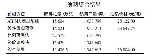 采用4種方法預(yù)測(cè)2014年鵝存欄量、鵝肉產(chǎn)量,以及2種方法預(yù)測(cè)2014年的活鵝價(jià)格(見表)。根據(jù)4種方法計(jì)算出的2014年鵝存欄量的平均值為17 406.5萬只,鵝肉產(chǎn)量為1747 613噸,鵝價(jià)格為26 884元/噸。另外,參照揚(yáng)州大學(xué)徐琪根據(jù)我國鵝品種統(tǒng)計(jì)的鵝年存欄量21195萬只,可以估算出2014 年我國鵝年存欄量將處在1.7億~2.1億只之間。因此,上述綜合預(yù)測(cè)結(jié)果是可信的。