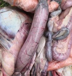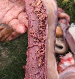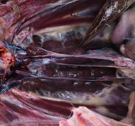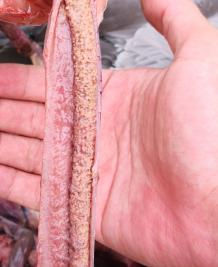 現(xiàn)場剖檢4只鵝,4/4只鵝出現(xiàn)腸粘膜脫漏、腸道充滿血樣液體、空腸回腸出現(xiàn)蠟樣栓塞;4/4只鵝出現(xiàn)胰腺有壞死點(diǎn);4/4只鵝腎腫脹;呼吸道癥狀不明顯,如下圖: