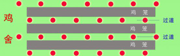 相鄰兩列照明燈應(yīng)交叉排列,以補(bǔ)足處于兩燈之間的雞群光照強(qiáng)度的不足,如果是H型籠,同列照明燈也可以采用一高一低的方式吊裝。排列方式如下圖示意: