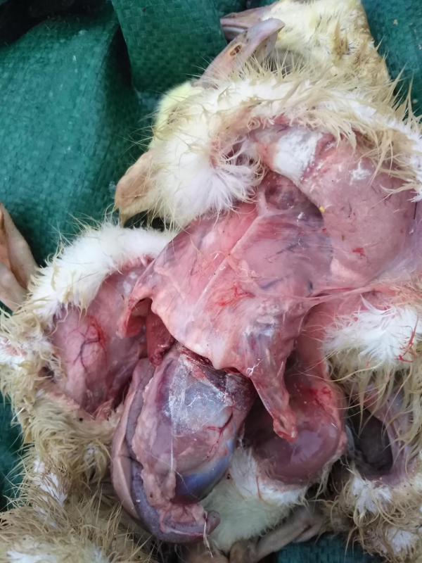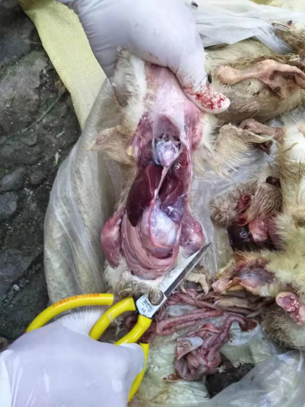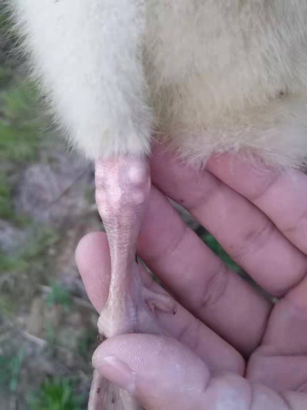 3、發(fā)病后期:表現(xiàn)站立不穩(wěn),喜臥,受驚嚇時也不能行走,雙側(cè)附關(guān)節(jié)明顯紅腫,喙發(fā)紅,體溫升高,脫水。附關(guān)節(jié)手感發(fā)燙,觸碰時雛鵝有疼痛感。大群拉水樣稀便。