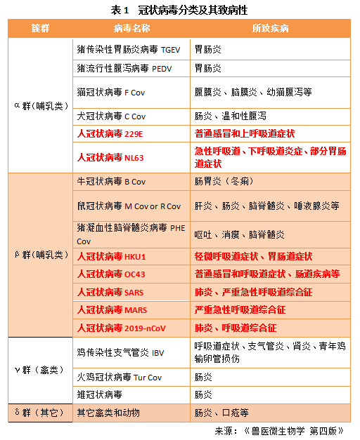 分類學上冠狀病毒屬套式病毒目-冠狀病毒科的單股正鏈RNA病毒,其復制依賴的RNA聚合酶缺乏校正功能,研究發(fā)現冠狀病毒有不連續(xù)轉錄和聚合酶跳躍的復制方式,這些特性導致病毒易發(fā)生高頻的基因重組和變異(Lai MMC et al., 1992),從而演化成不同簇群。這類病毒大家族擁有許多家庭成員,是自然界中存在的可引起家畜、家禽、寵物和人類疾病的重要病原體。根據其基因差異,分為α、β、γ和δ4個簇群,可分別感染不同的宿主引起各種臨床癥狀,α、β簇群主要感染哺乳動物,而γ、δ簇群主要感染禽類(表1)。