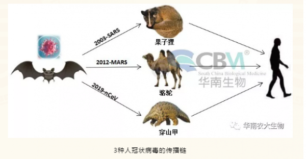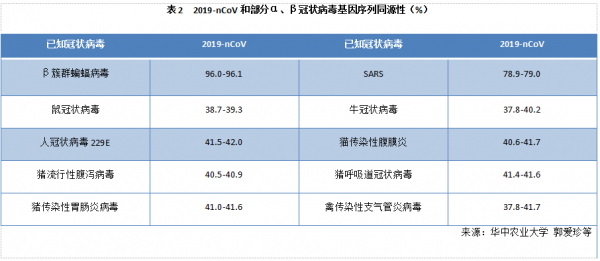 人源冠狀病毒:目前發(fā)現能夠感染人類并誘發(fā)疾病的冠狀病毒共有7種,其中3種為高致病性毒株。①是最為人們熟悉的非典肺炎病毒2003-SARS,中國科學院武漢病毒研究所的科研團隊經多年溯源性研究發(fā)現病毒源自云南地區(qū)的中華菊頭蝙蝠,揭示了“蝙蝠→果子貍→人類→人際”的傳播鏈條;②是暴發(fā)于沙特阿拉伯,席卷整個中東和歐洲地區(qū)的中東呼吸綜合征病毒2012-MERS,則是通過駱駝再傳播到人類的。③是本次發(fā)生疫情的病毒2019-nCoV,近期取得了許多進展。華中農業(yè)大學研究人員分析比對了GISAID數據庫2019-nCoV全基因組序列發(fā)現與已知的云南蝙蝠β冠狀病毒(BetaCoV/bat/Yunnan/RaTG13/2013| EPI_ISL_402131)高度相似,達96.0%-96.1%;與2003-SARS相似性為78.9-79.0%;而與其他人和動物冠狀病毒間的基因組相似性只有40%左右(表2)。中國動物衛(wèi)生與流行病學中心對2019-nCoV與禽源冠狀病毒的親緣關系進行分析發(fā)現二者核苷酸同源性較低,初步排除來源于已知家禽冠狀病毒的可能性。而就在2月7日華南農業(yè)大學等單位通過對野生動物樣品的宏基因組學分析并鑒定分離自穿山甲的冠狀病毒毒株基因序列與2019-nCoV同源性高達99%,說明穿山甲為潛在的中間宿主。