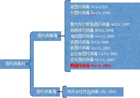 最早在2002年,德國科學(xué)家Hattermann 發(fā)現(xiàn)勃蘭登堡某養(yǎng)鴨場的法國番鴨表現(xiàn)出羽毛凌亂、生長遲緩、體重減輕等癥狀,認(rèn)為這與其他禽類感染圓環(huán)病毒后的臨床特點(diǎn)很相似,于是對樣品進(jìn)行負(fù)染電鏡(EM)檢測發(fā)現(xiàn),法氏囊中存在無囊膜的球狀病毒,直徑大約為 15~16nm。最終根據(jù)圓環(huán)病毒rep基因的鑒定,發(fā)現(xiàn)與其他圓環(huán)病毒同源性僅39%~60%,與鵝圓環(huán)病毒同源性最高,但也僅為82%。推斷新發(fā)現(xiàn)的可能為新的圓環(huán)病毒,鴨圓環(huán)病毒DuCV。