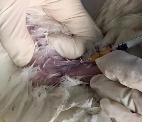 2、找到雞的臂靜脈(內(nèi)側(cè)翼靜脈),靜脈位于二頭肌和三頭肌之間的翅膀下,與肱骨、臂骨平行,區(qū)域類似三角形,幾乎無羽毛覆蓋,很容易找到。